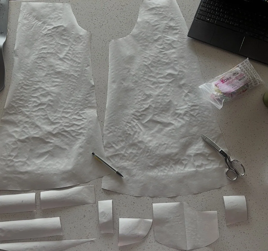 Two-piece ensemble crafted from reclaimed organic cotton sheets, developed using independently acquired pattern-making techniques.
