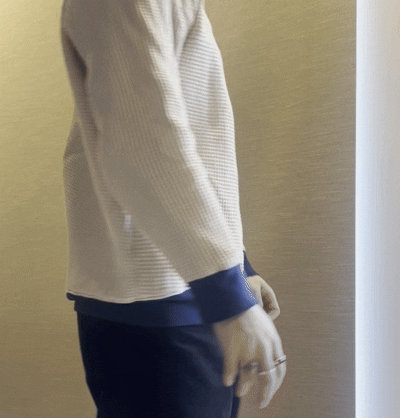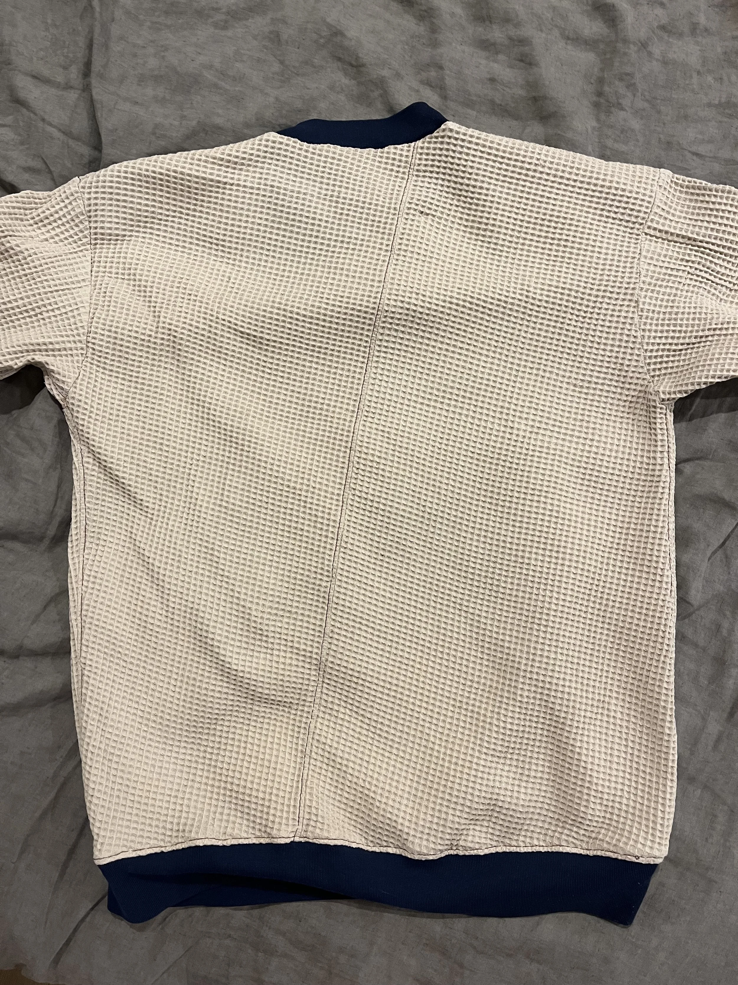 Crewneck sweater constructed from repurposed waffle-textured cotton scraps and surplus fabric from previous garments, thoughtfully reimagined to minimize waste while maintaining a refined finish.
